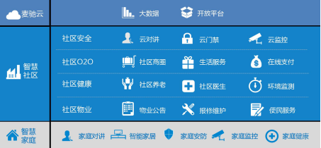 其打造的智慧社区平台囊括云对讲、云门禁、云安防、云监控、云家居等八大板块。针对业主生活,麦驰还打造了社区O2O商圈。社区商圈依托移动互联网技术,以社区为服务单位,满足社区居民的消费需求。它离消费者的距离不超过“1公里”,服务响应时间不超过 “半小时”,具有快捷、方便、安全等特点。麦驰智慧社区解决方案采用软硬件无缝对接,实现社区手机APP门禁开锁、云对讲、云门禁、云监控、社区商圈、养老社区紧急求助系统及社区物业管理为一体的智慧社区平台运营。