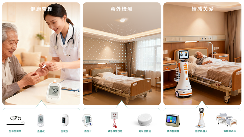 · 智慧呼叫与关怀系统,情感关爱· 健康数据收集、可视化与远程协作