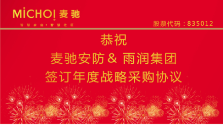 2017年2月,麦驰安防与雨润集团签署2017年度战略采购协议,麦驰安防凭借在楼宇对讲领域稳定的产品性能,可靠的产品质量以及完善的售后服务成为雨润集团楼宇对讲战略控购供应商。